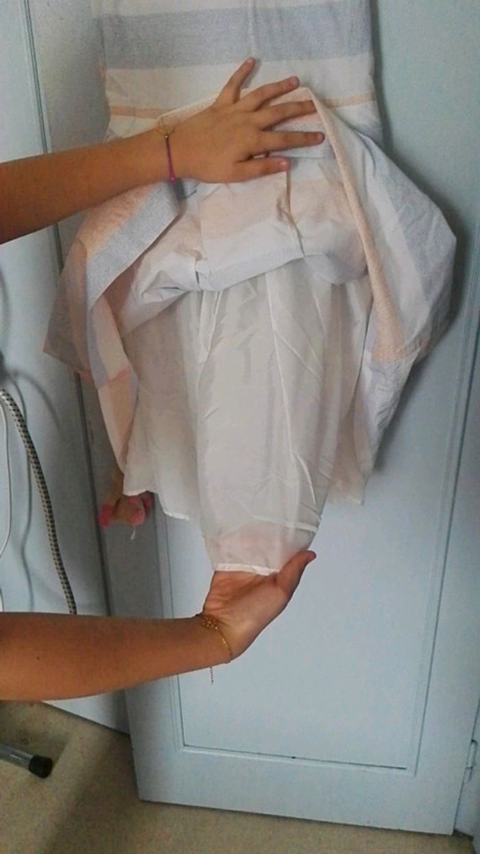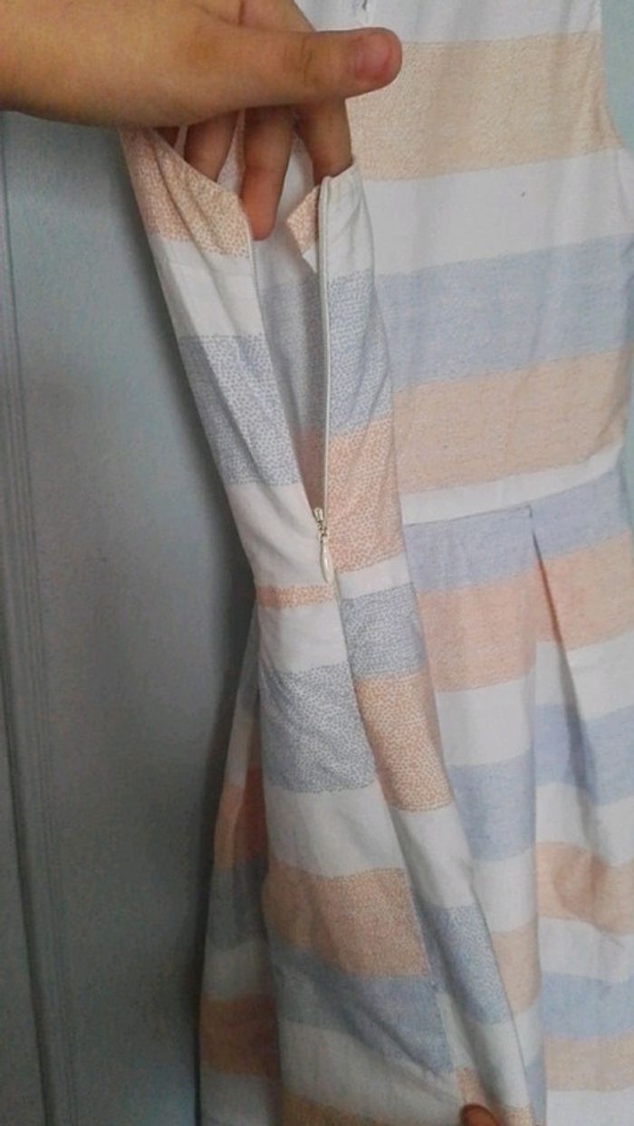 Robe 12 ans kiabi , avec 1 petit bouton en haut du dos et 1 fermeture éclair sur le côté gauche. Couleur pastel.