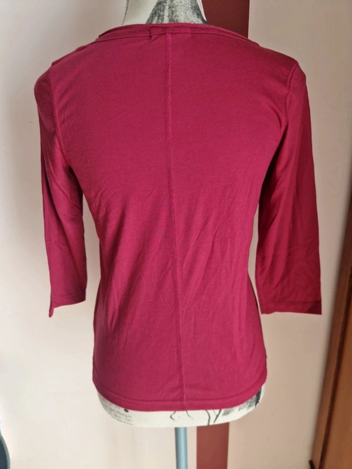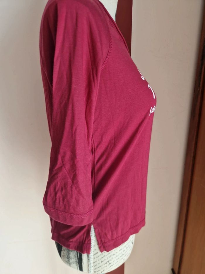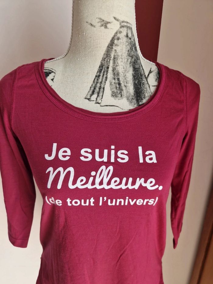 T-shirt bordeaux, encolure ronde, manche 3/4, inscription floquée, taille 36, de la marque Jennyfer, en très bon état