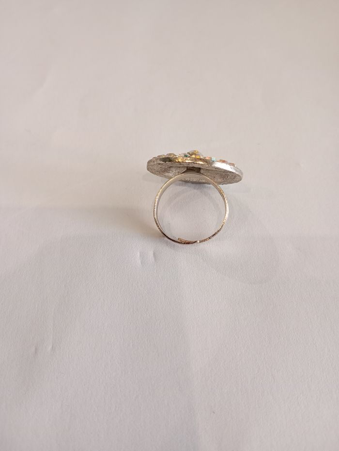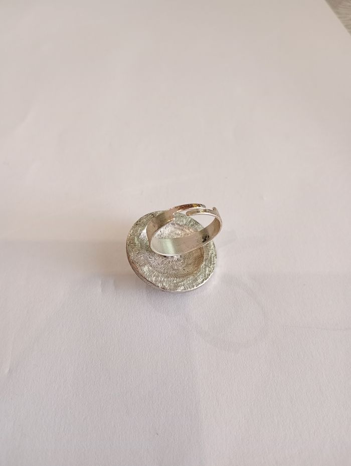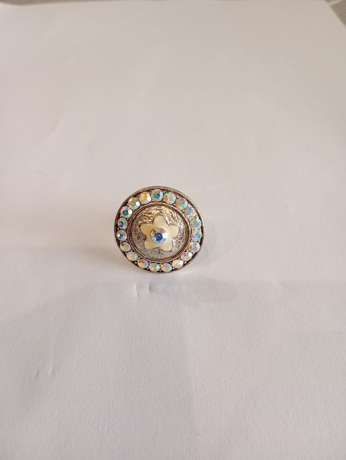Bague avec fleur et strass ( diamètre 2,5 cm). Ajustable. Bon état