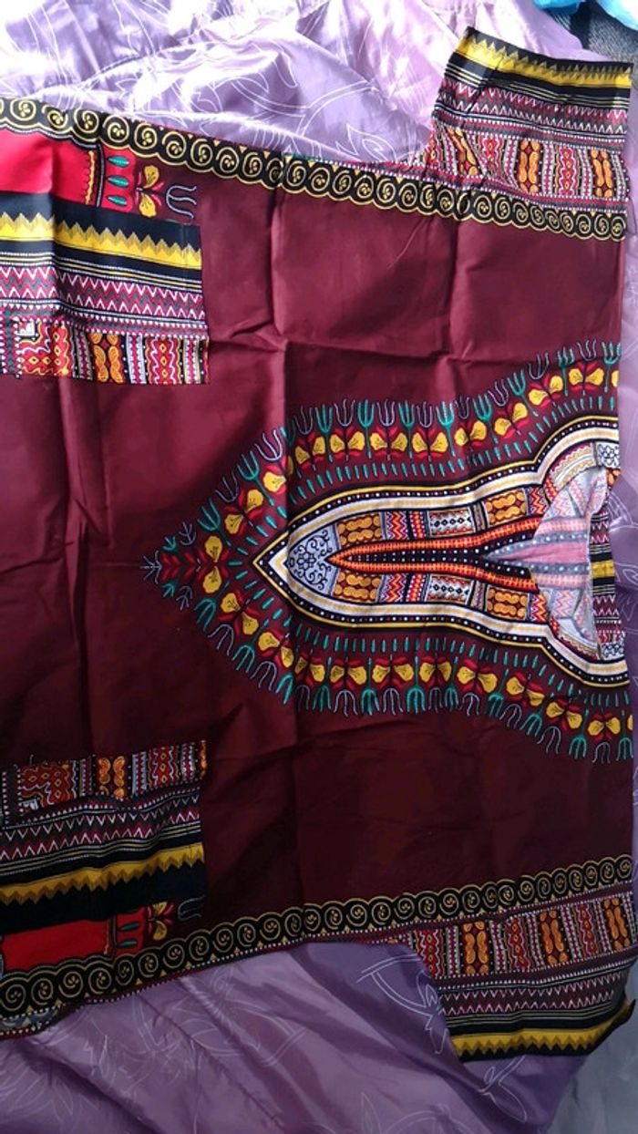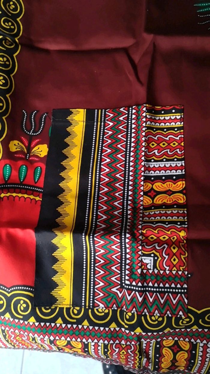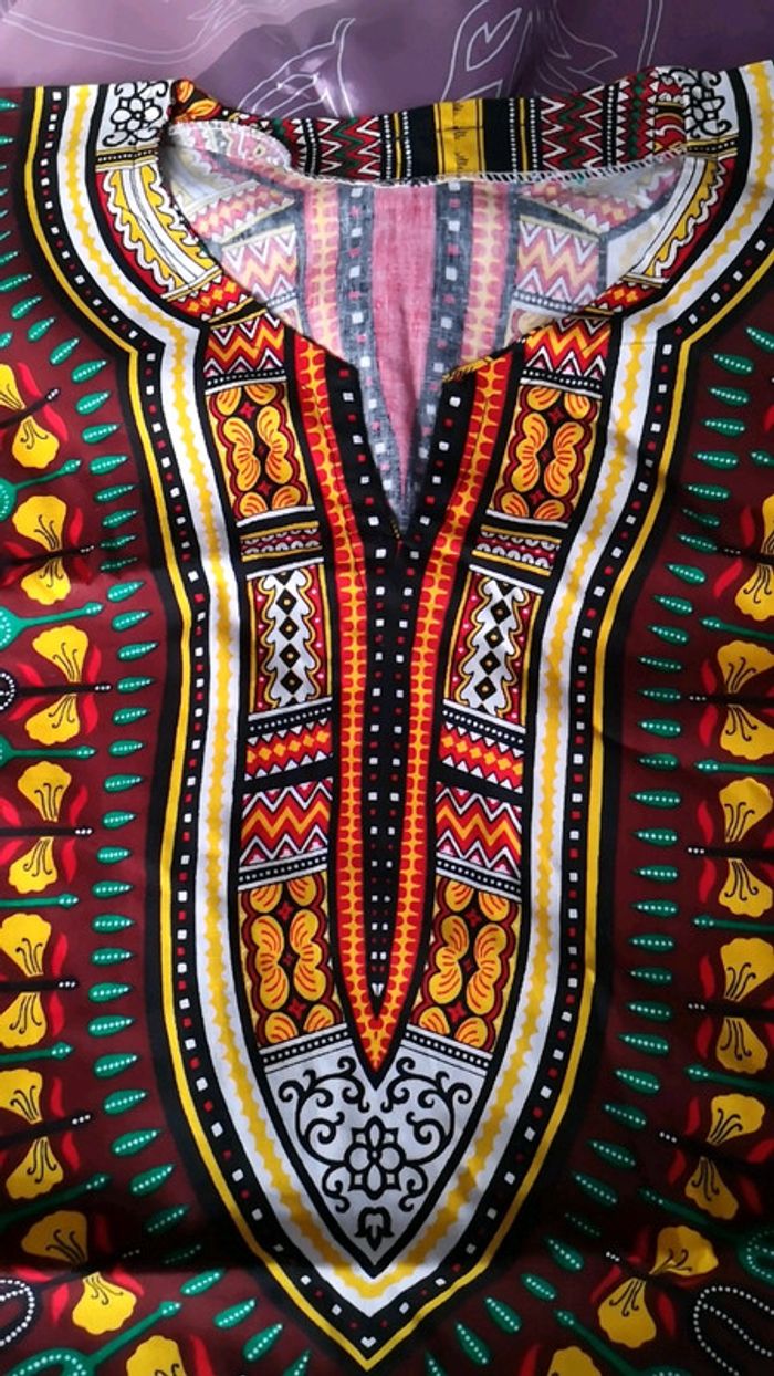 Coupe droite et large Col quasi rond Manches courtes Marron motifs wax Poches sur le devant Jamais portée