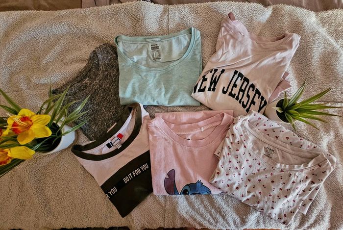 🍫 lot de 5 tee shirts taille XS 🍫 + 1 offert. ( tee shirt court jenyfer ) Le lot est composé de : 🍒 1 tee shirt kiabi avec motifs cerises - bon état. 🎀 1 tee shirt Disney Stitch - bon état 🦳 1 tee shirt Kiabi gris chiné - très bon état 📘 1 tee shirt bleu ciel chiné- très bon état 💜 1 tee shirt tye and die mauve très clair - très bon état #loteeshirtxs #teeshirtsxs #lotxsfemme #pitch13011_mondressing #pitch13011_vêtementsfemme
