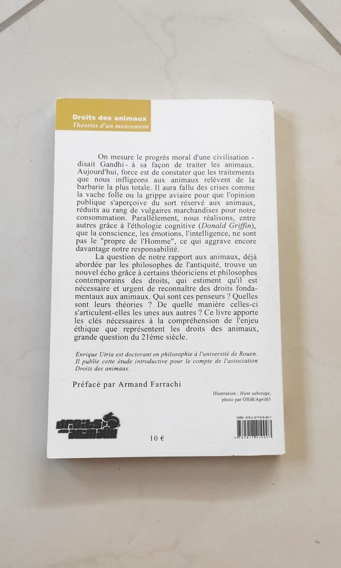 Livre rare. On mesure le progrès moral d’une civilisation — disait Gandhi — à sa façon de traiter les animaux. Aujourd’hui, force est de constater que les traitements que nous infligeons aux animaux relèvent de la barbarie la plus totale. Il aura fallu des crises comme la vache folle ou la grippe aviaire pour que l’opinion publique s’aperçoive du sort réservé aux animaux, réduits au rang de vulgaires marchandises pour notre consommation. Parallèlement, nous réalisons, entre autres grâce à l’éthologie cognitive (Donald Griffin), que la conscience, les émotions, l’intelligence, ne sont pas le « propre de l’Homme », ce qui aggrave encore davantage notre responsabilité. La question de notre rapport aux animaux, déjà abordée par les philosophes de l’antiquité, trouve un nouvel écho grâce à certains théoriciens et philosophes contemporains des droits, qui estiment qu’il est nécessaire et urgent de reconnaître des droits fondamentaux aux animaux. Qui sont ces penseurs ? Quelles sont leurs théories ? Que quelle manière celles-ci s’articulent-elles les unes aux autres ? Ce livre apporte les clés nécessaires à la compréhension de l’enjeu éthique que représentent les droits des animaux, grande question du 21ème siècle.livre