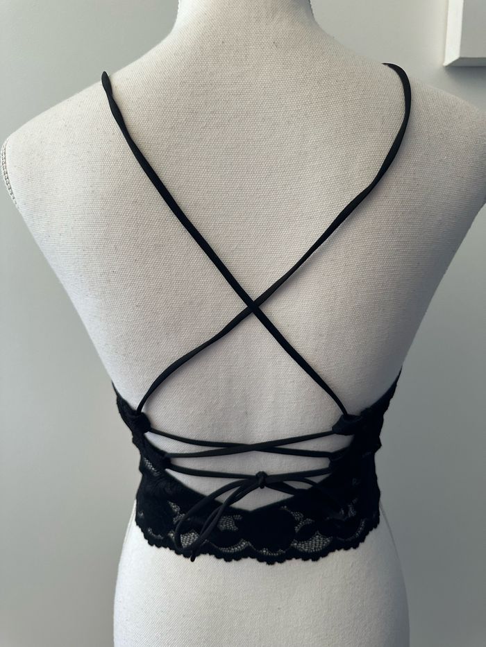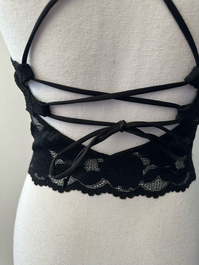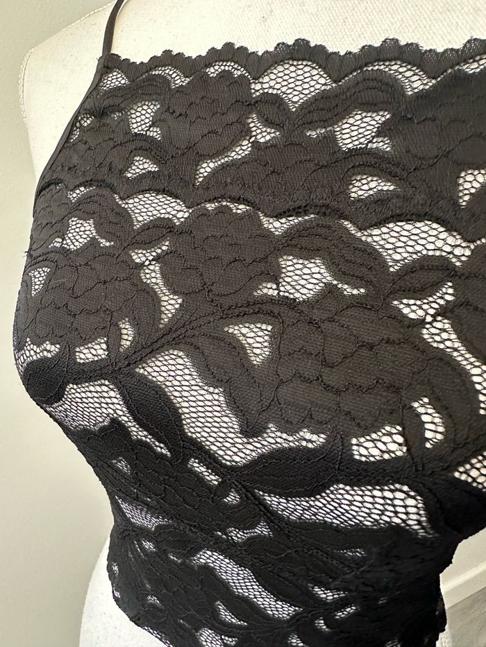 Crop top - Excellent état - Taille 38 équivalent M - Dentelle transparente fleurs pivoines - Liens dans le dos - Couleur noire - Vintage, années 80-90’ - Plus d’étiquette de taille ni de matière