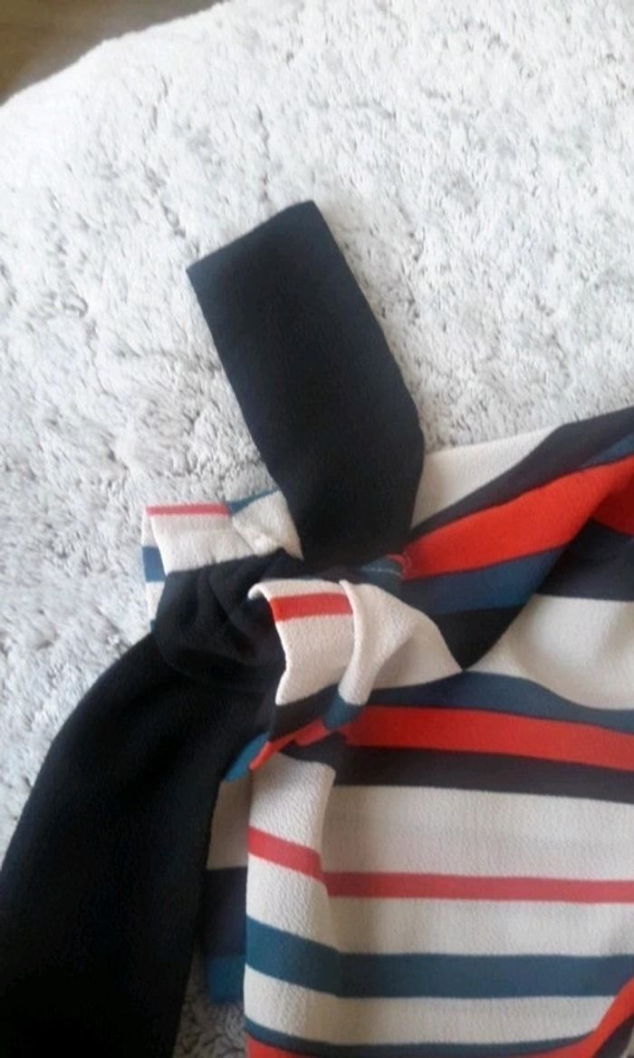 Jolis haut manche courtes à rayures, avec ruban à nouer au bout des manches. Coutures marquées pour la forme de la poitrine (photo 2). #hautstelpha #tailles40telpha