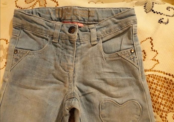 Jean bootcut, bleu clair. Fermeture avec bouton pression. En bon état général mais trace de Feutre au bas du pantalon. Décoloration, 2 coeurs sur la jambe gauche et des brillants sur les poches. Possibilité de resserrer la taille du pantalon par 2 élastiques et des boutons au niveau de la ceinture intérieur. (Voir la photo) Marque: NKY Taille: 4 ans #pantalonstelpha #4anstelpha #jeanstelpha