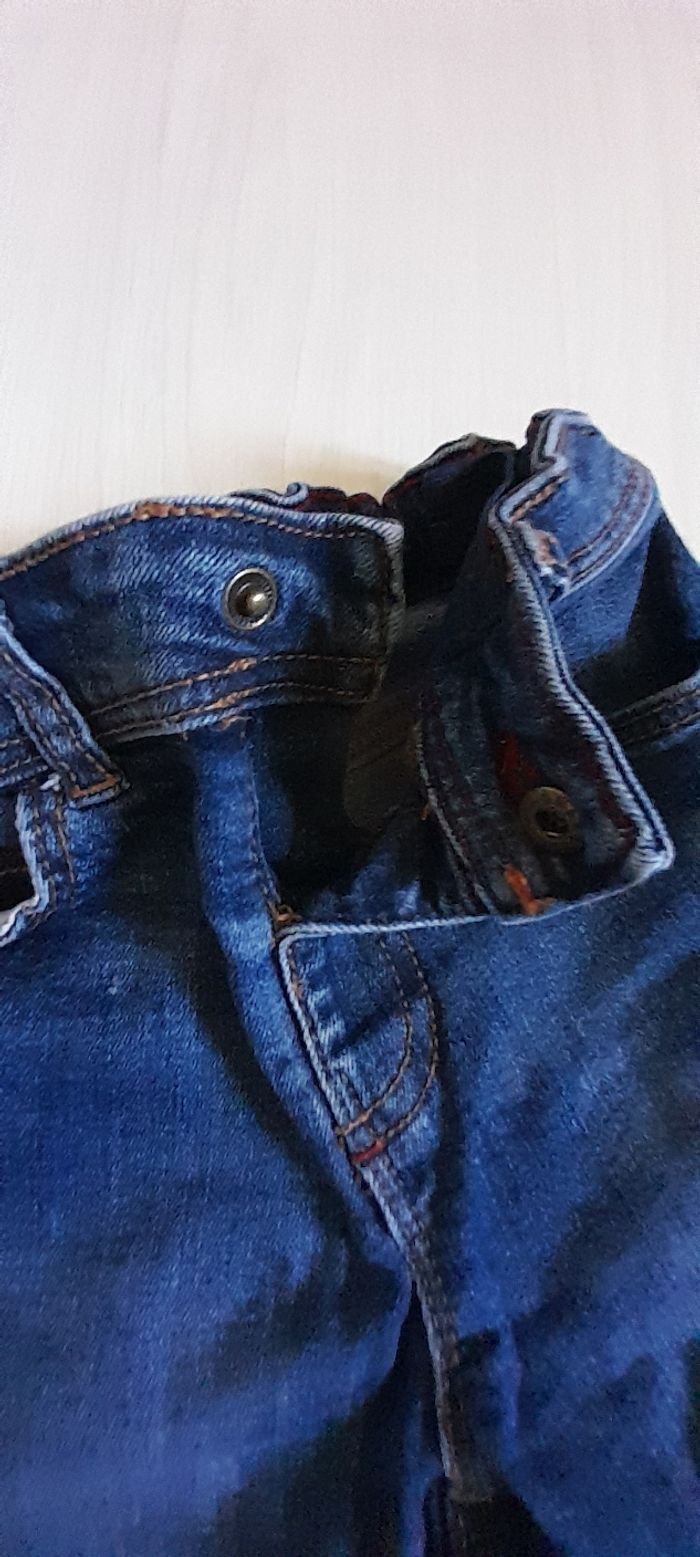 Bermuda T 4 ans Marque DENIM Couleur bleu marine 3 poches devant 2 poches arrière Taille élastique avec pression et possibilité de resserrage Passants pour ceinture 99% coton et 1 % spandex Très très bon état