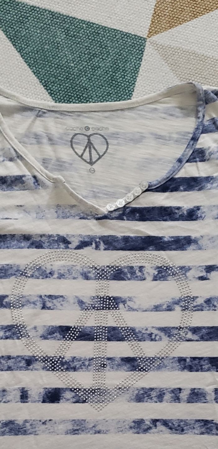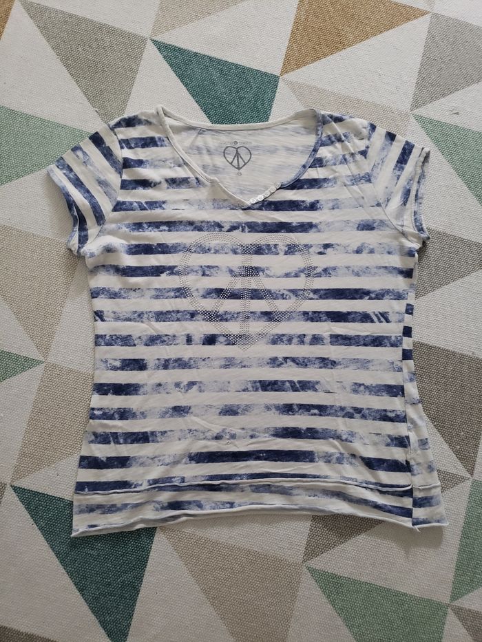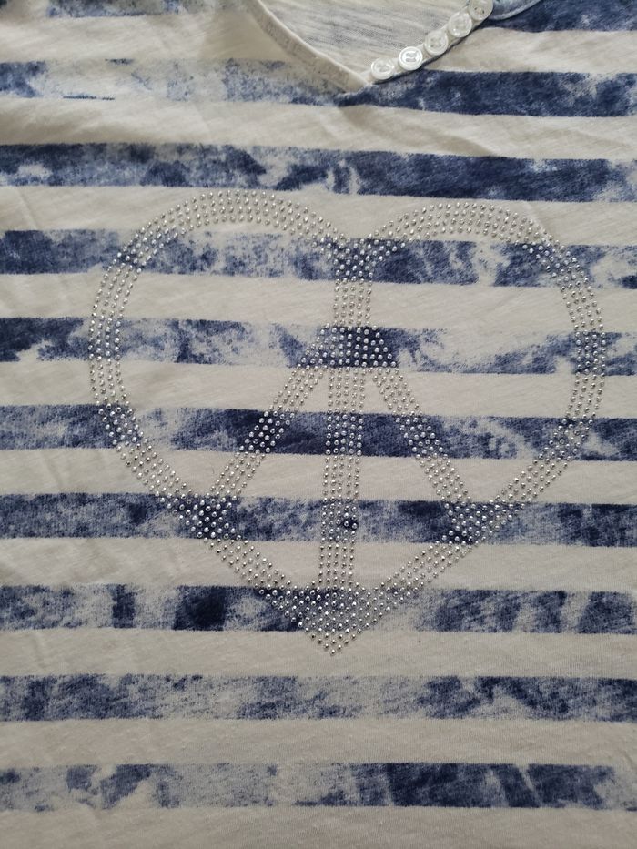 Je brade ‼️ Article en parfait état Grand cœur en strass Tshirt manches courtes Coton blanc/bleu à rayures Taille 4 => idéal pour du 40 ou L