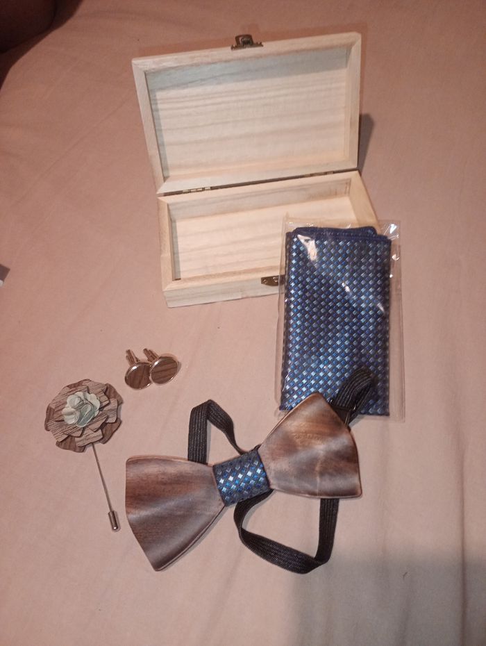 Ensemble noeud papillon en bois. Porté une fois en parfait état. Vendu avec l'ensemble dans la boîte en bois.