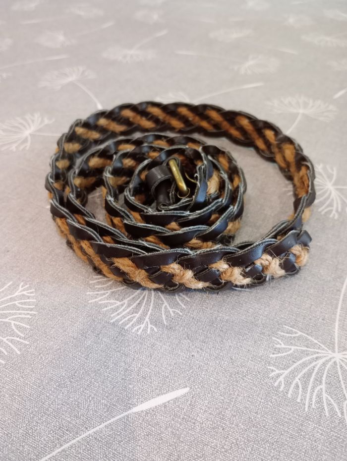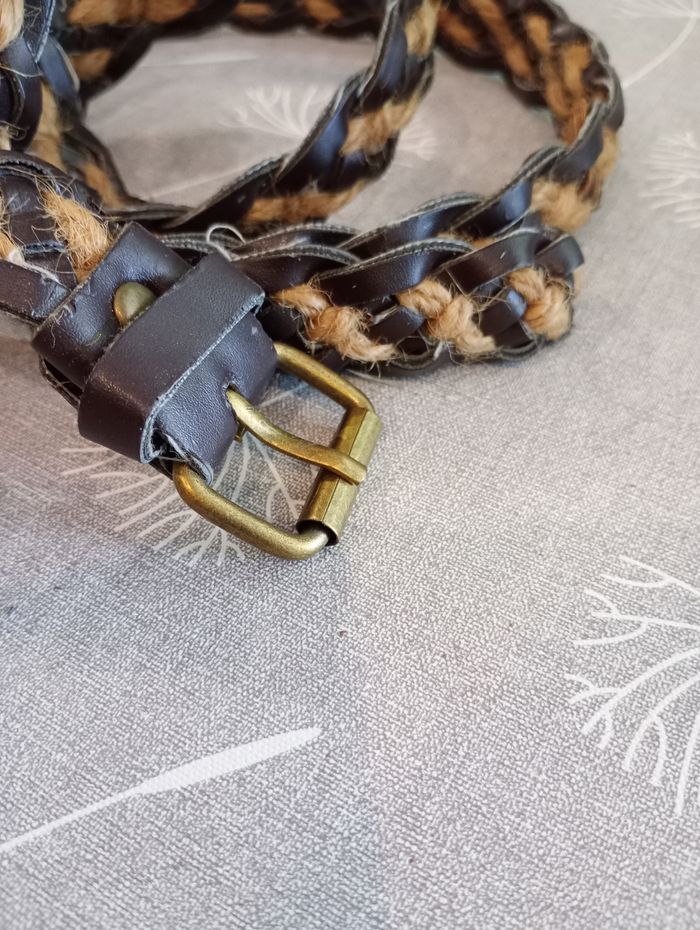 Ceinture avec tressage de corde et de simili cuir marron. Longueur : 122 cm. Bon état