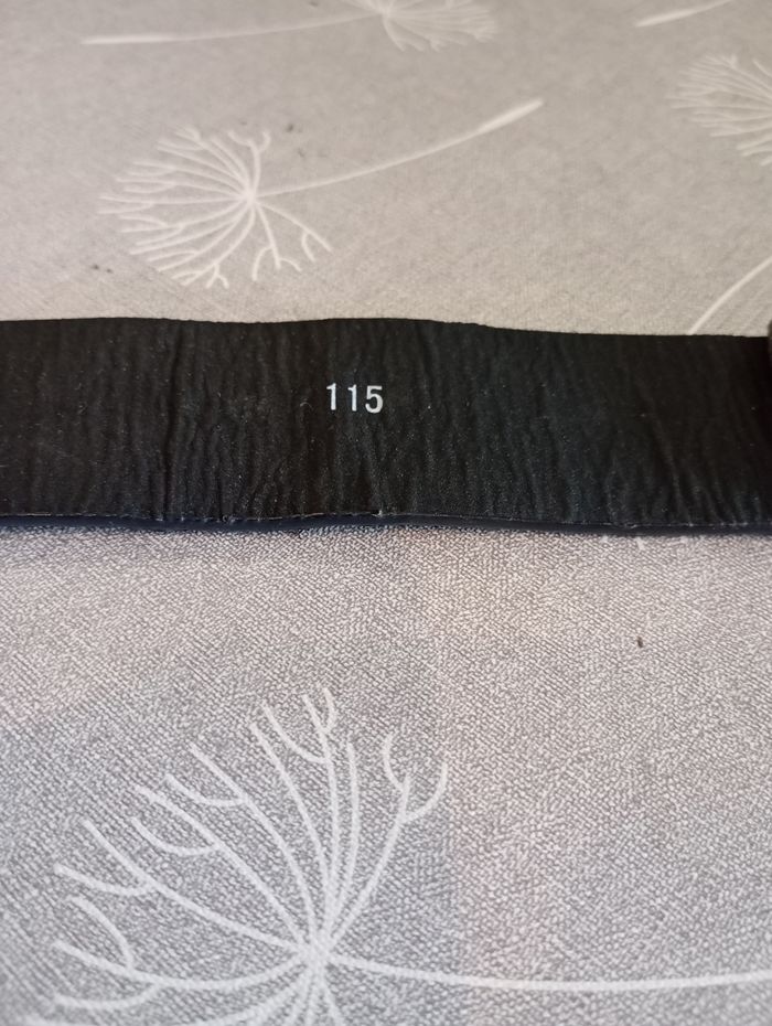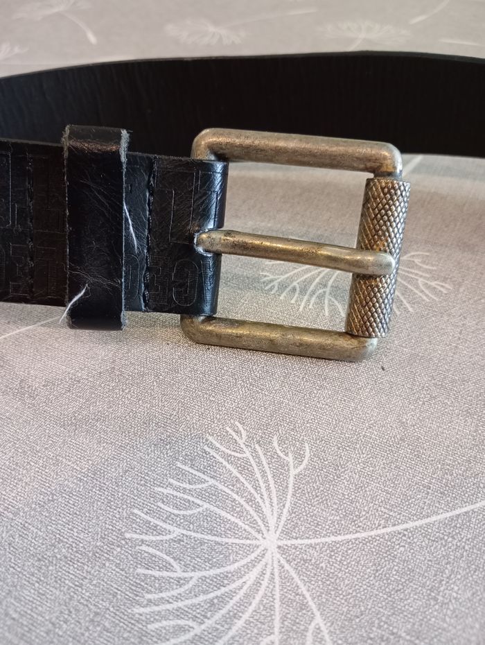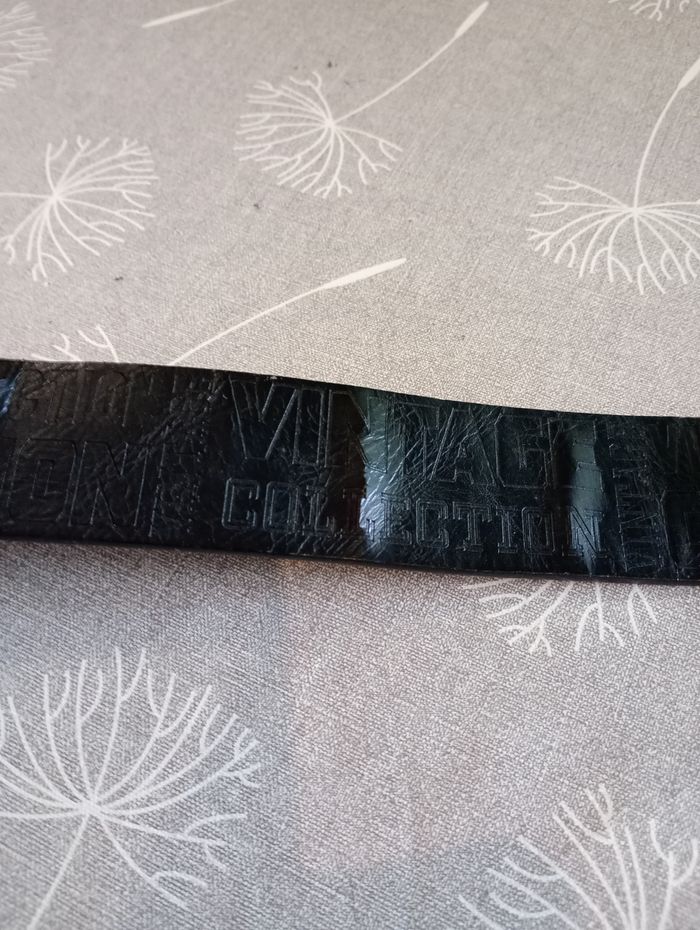 Ceinture noire en simili cuir. Avec écriture "Vintage collection". Longueur : 133 cm. Etat moyen