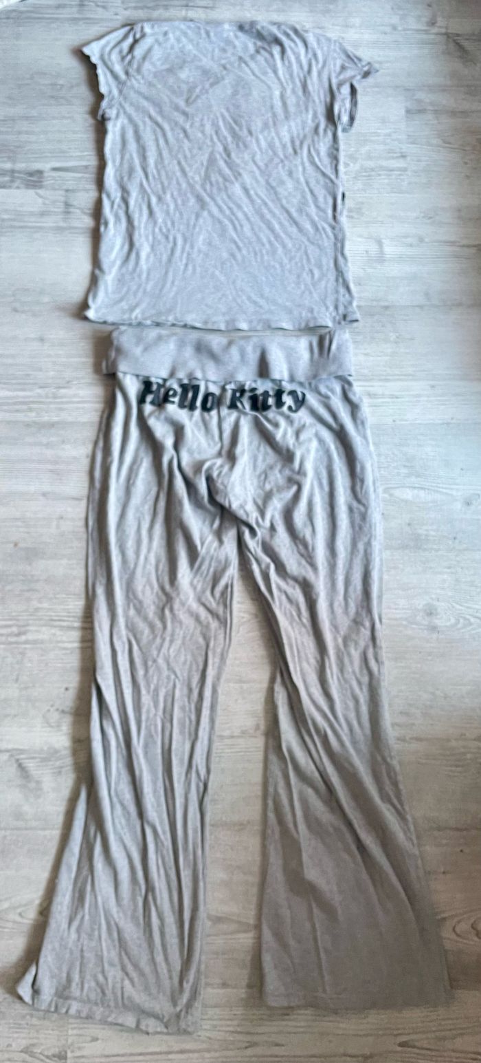 Pyjama 2 pièces tee shirt et pantalon Hello Kitty de la marque H&M Présence de petites bouloches et traces d’utilisation Occasion, état satisfaisant