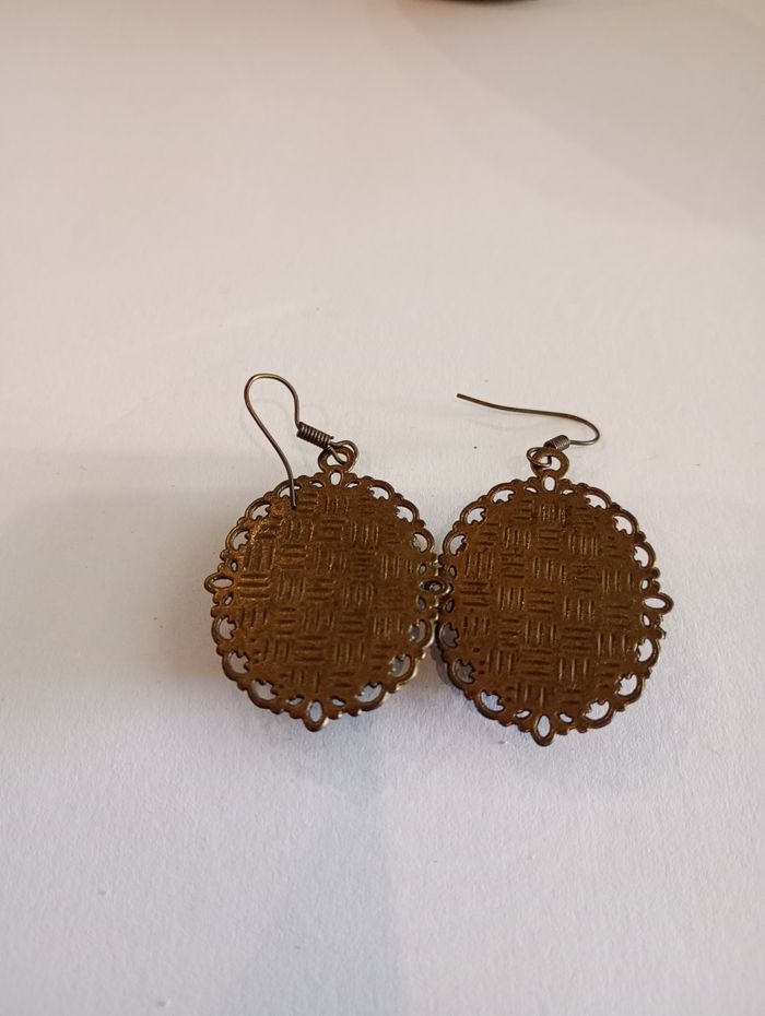 Boucles d'oreille avec cabochons et dessins d'oiseaux. Métal doré vieilli. Dimensions sans attaches : 3,8 x 2,8 cm. Très bon état.