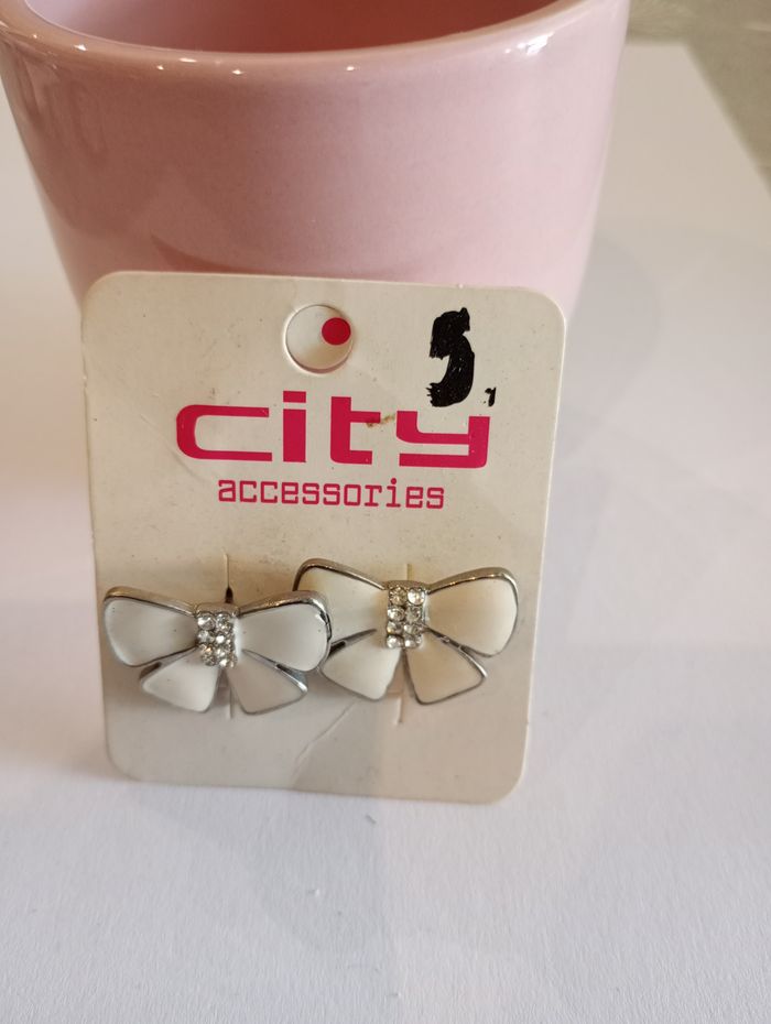 Boucles d'oreille en forme de noeud blancs avec strass. Dimensions : 2,5 x 2 cm. Marque : City Accessories. Neuves