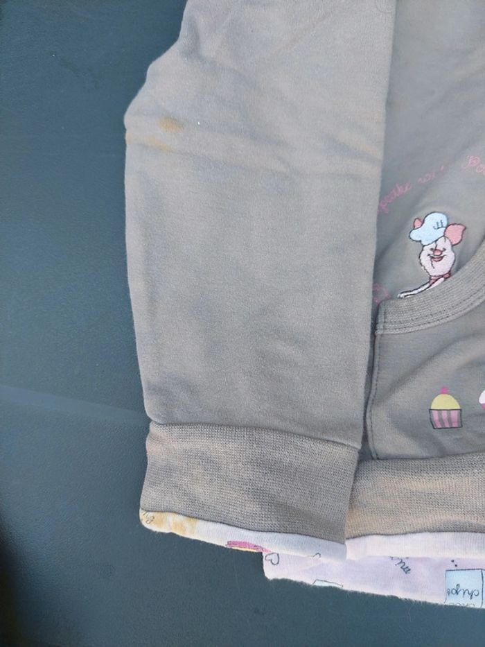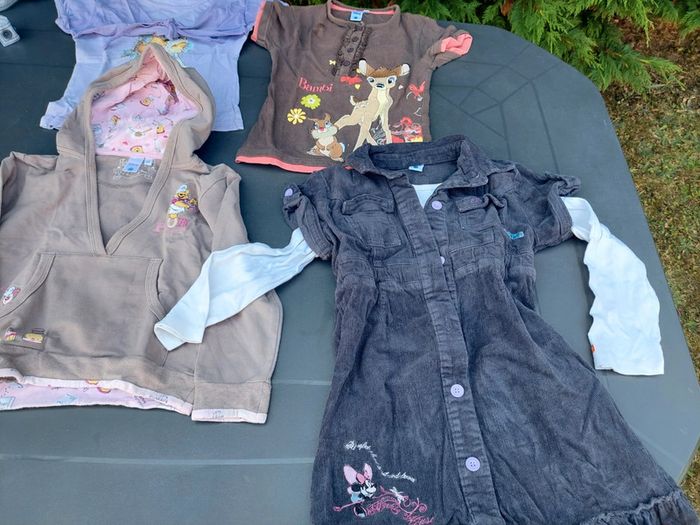 2 t-shirt ( 1 Sarah kayak, 1 bambi), 1 ensemble robe velours minnie + t-shirt ml blanc, 1 sweat winnie(tache voir photo)