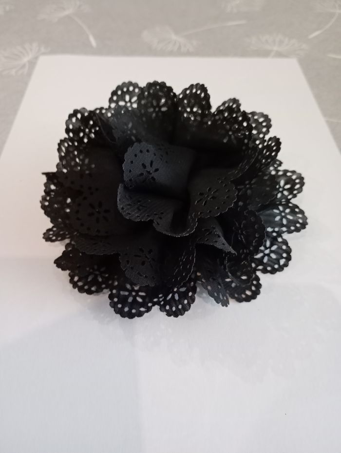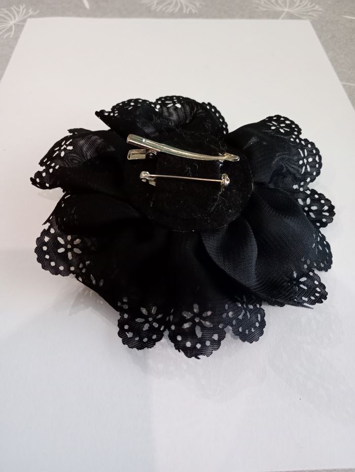 Fleur noire. Peut être accrochée dans les cheveux avec la pince ou comme broche. Diamètre : 13 cm. Très bon état