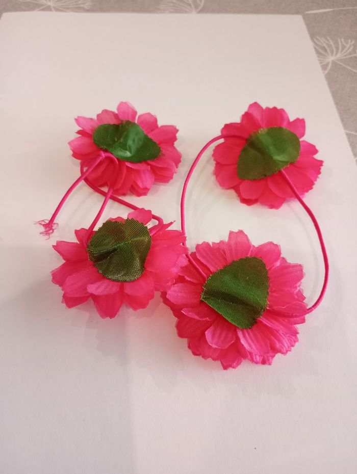 Elastiques pour cheveux avec des grandes marguerites roses (5,5 cm). Un nœud a été fait dans un des deux élastique. Très bon état.