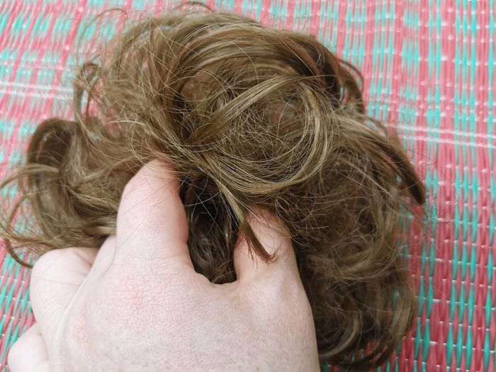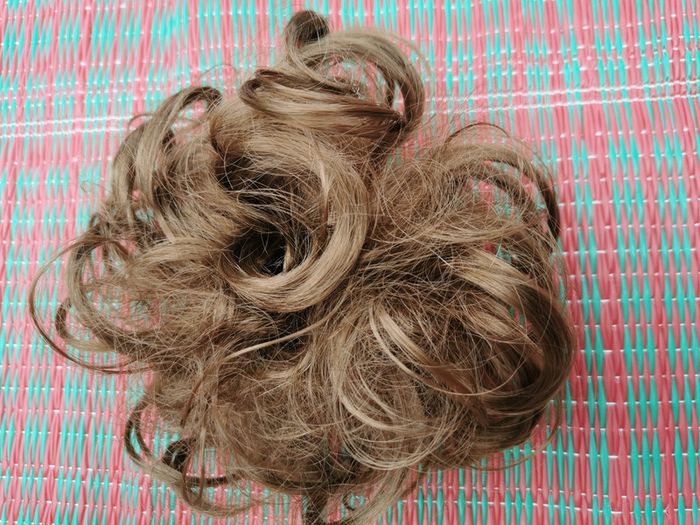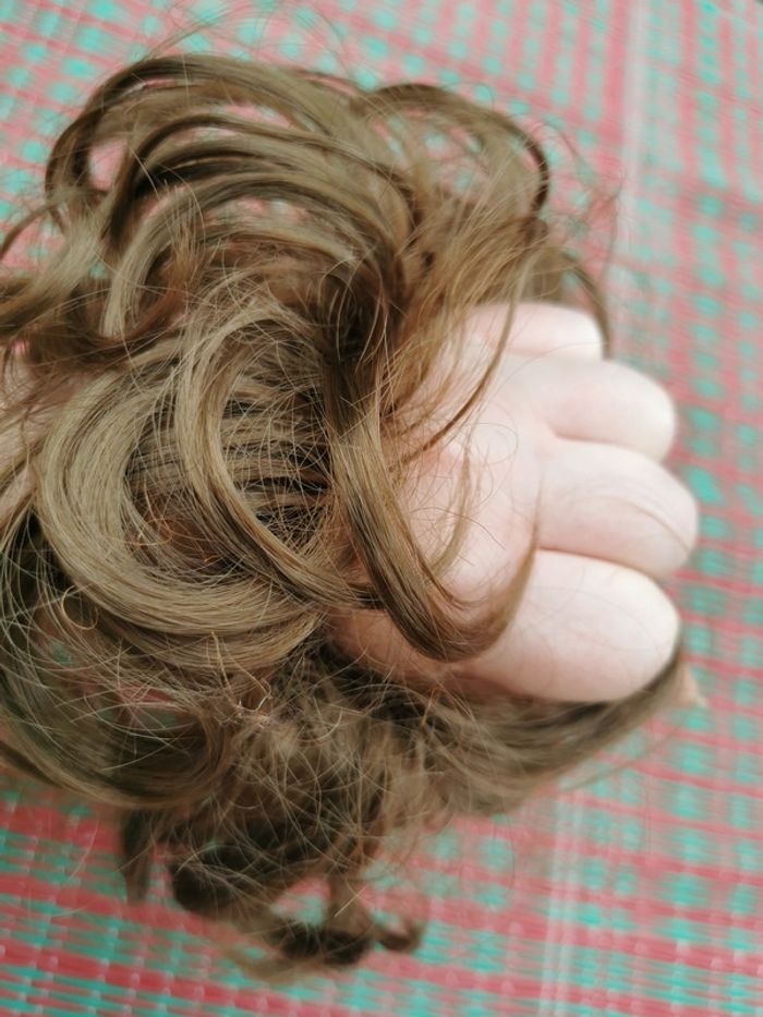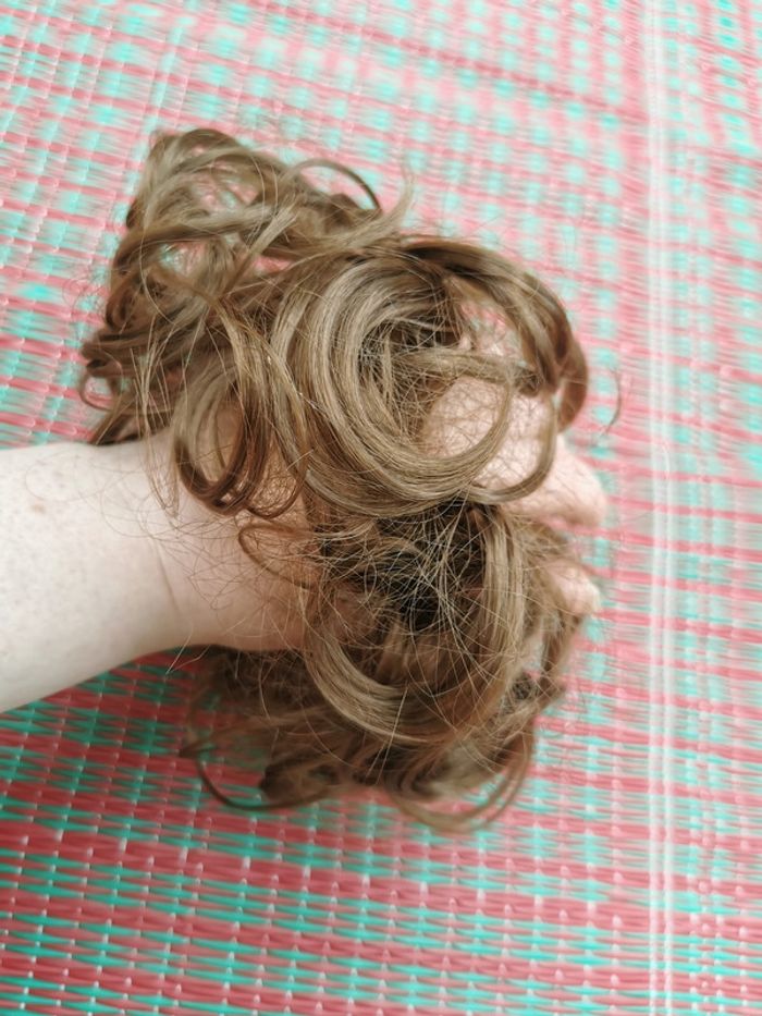 Chouchou faux cheveux bouclés chatain clair, en très bon état général. Pensez à faire des lots afin de bénéficier des remises que j'ai régulièrement sur ma page. #chouchou #chouchouchignon #fauxcheveux #perruque