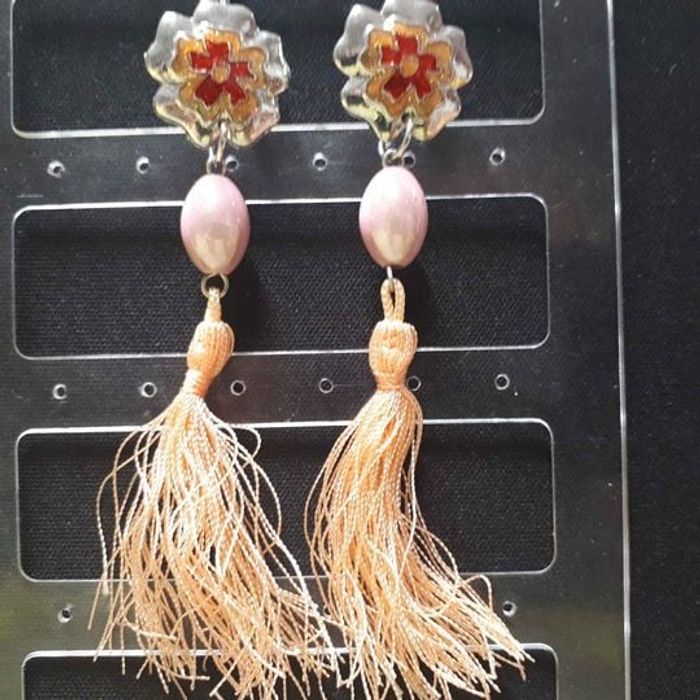 Boucles d'oreilles femme Avec franges Forme fleurs Matières métal, tissus et plastique Couleurs argenté, orange, rouge et rose Fermoirs dormeuses Dimensions 10cm de long et 2cm de large En très bon état