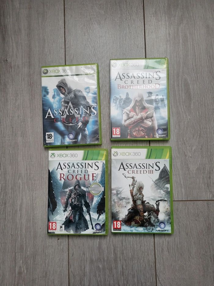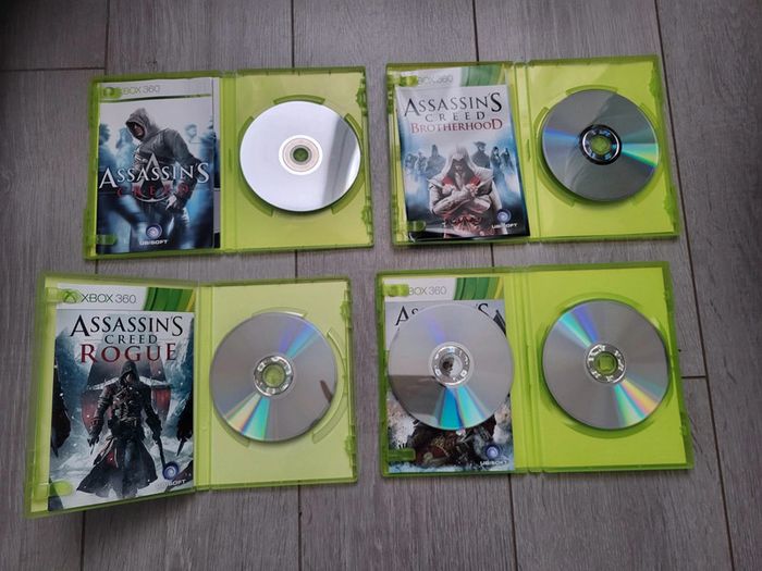 Lot de 4 jeux assassin's screed En bonne état Quelques rayures sur assassin's creed et brotherhood Ne gêne en rien le bon fonctionnement du jeu Xbox360