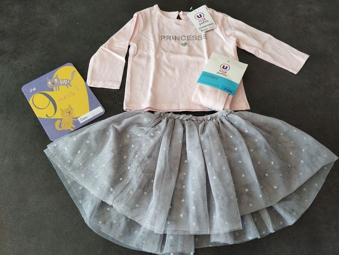 Ensemble tenu tee shirt à manches longues princesse+ une jupe et des collants 9 mois u