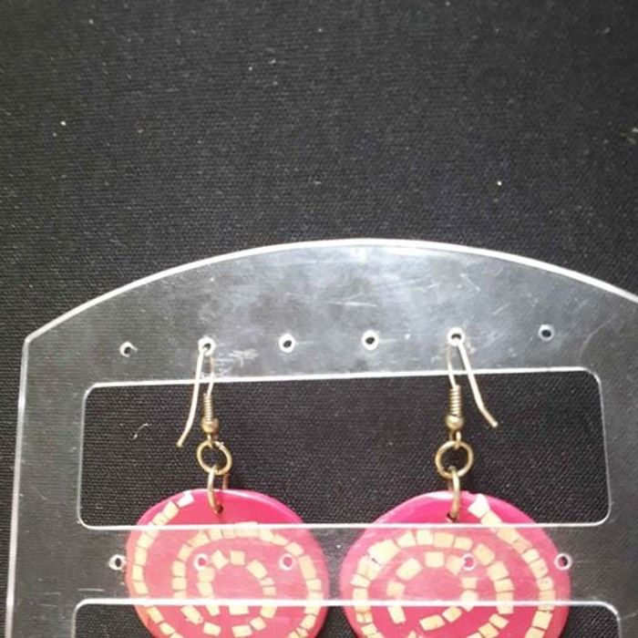Boucles d'oreilles femme Forme ronde Matières métal et plastique Couleurs doré, beige et rose Fermoirs crochets Dimensions 6cm de long et 3,5cm de large En très bon état