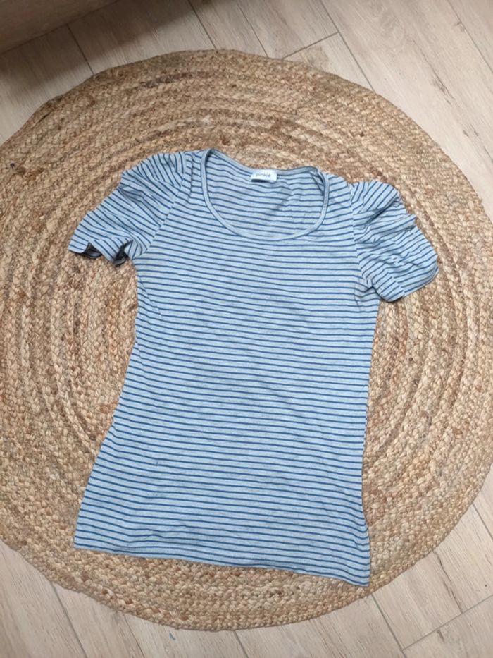 Tee-shirt rayé bleu et gris avec manche courte légèrement bouffante, présente une petite tâche sur le devant (voir 3eme photo), très peu visible.