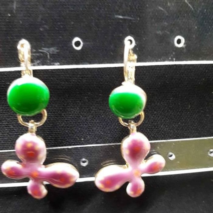 Boucles d'oreilles femme Forme fleurs Matière métal Couleurs argenté, vert et rose Fermoirs dormeuses Dimensions 4,5cm de long et 2cm de large En très bon état