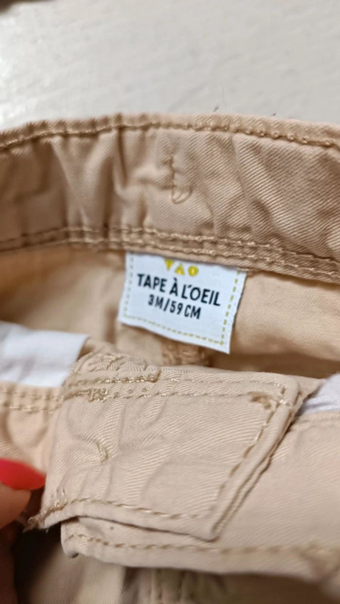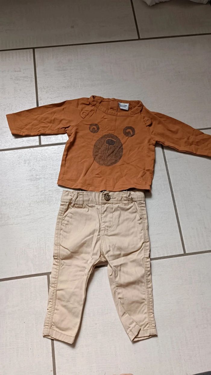 Ensemble pantalon Chino beige + tee shirt manches longues marron motif ourson en taille 3 mois Marque Tape à l'oeil Pantalon Chino avec boutons au niveau de la taille pour ajuster Tee shirt avec boutons pressions à l'arrière pour ouverture Très bon état