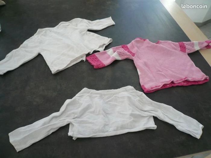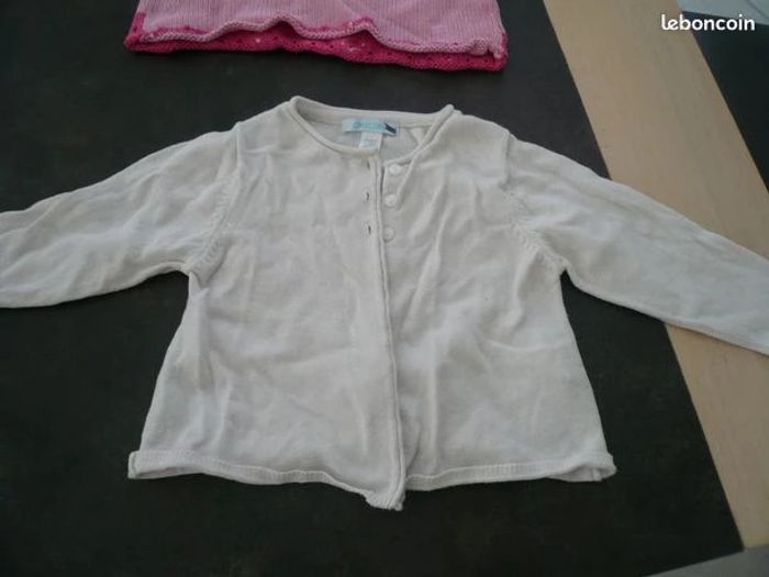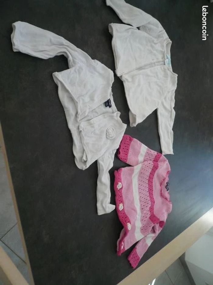 vends: -1 gilet blanc marque OBAIBI (okaidi) 12 mois ou 74 cm. 3 boutons sur la partie haute= 1€ -1 gilet court blanc avec une fleur 12 mois marque kiabi.4 boutons = 1€ -pull léger rose 100% coton 12 mois marque Bob et Julie = 1€ tout est en très bon état lot de 3 vêtements= 2€