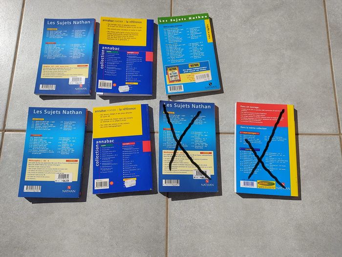 Vends annabac corrigés - anglais 2000. Corrigés. LV1 LV2. Nathan - anglais 1999 . Hatier - maths 99. Obligatoire s Nathan - abc bac 2002. Mathématiques. Obligatoire s. Nathan. VENDU - mathématiques bac 2000. Obligatoire s. Nathan. VENDU - philosophie. L- es - s. Bac 2000. Nathan - annabac Hatier 99. Philosophie. Vendu Ils sont tous en très bon état. Quelques annotations, croix au sommaire et exercices pour certains mais qui ne gêne pas. 1€/pièce ou 2.50€ les 4 livres Me contacter pour ajuster les frais en fonction du nombre de livres