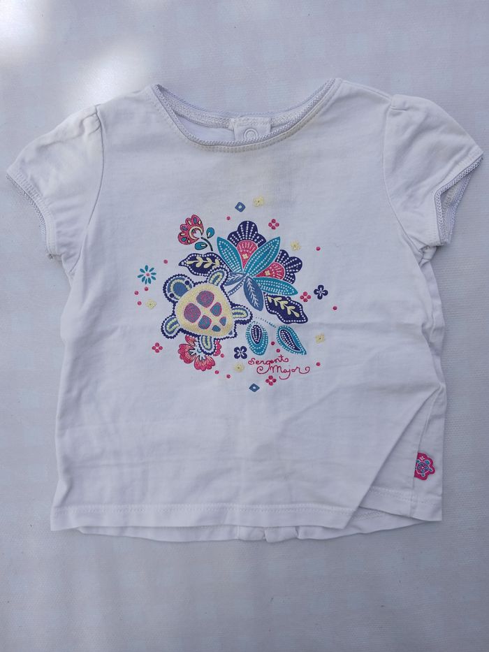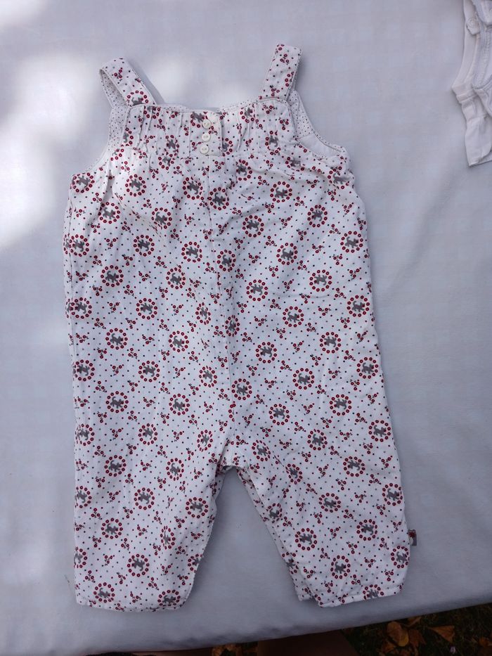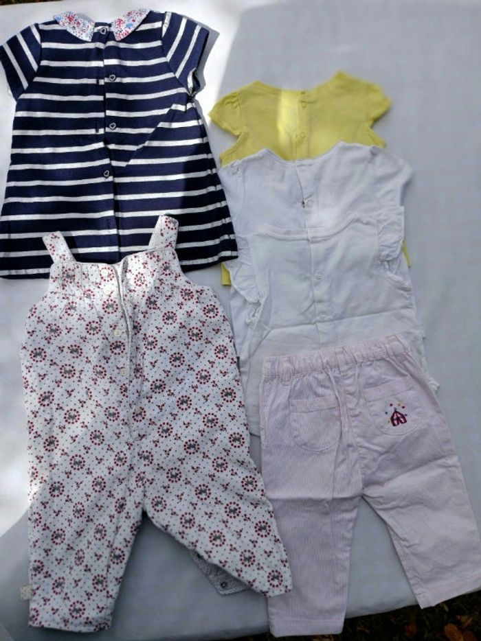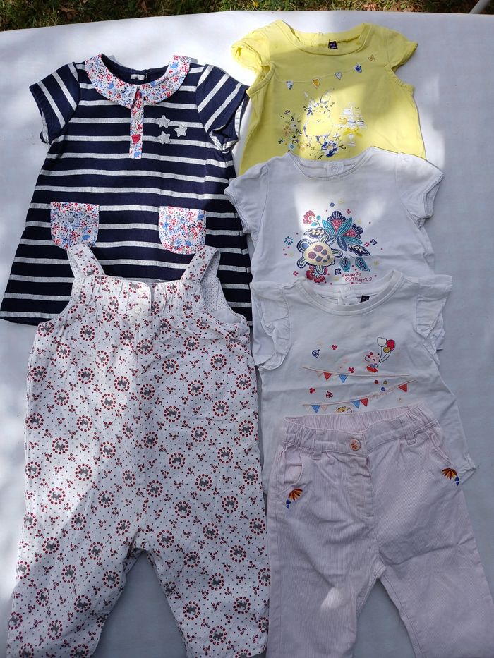 Lot comprend: *1 salopette (ouverture dos et entrejambe) *3 tee-shirt (ouverture complète dans le dos par bouton pression) *1 robe (ouverture complète dans le dos par bouton pression) *1 pantalon Taille 6 mois (68cm) Marque : Sergent Major Très bon etat