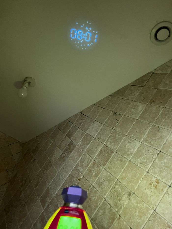 Projecteur de l’heure au plafond ( voir photo 2) À la radio, des jeux, de la musique, un réveil, fait de la lumière et montre l’heure. Marche à pile À partir de 6 ans