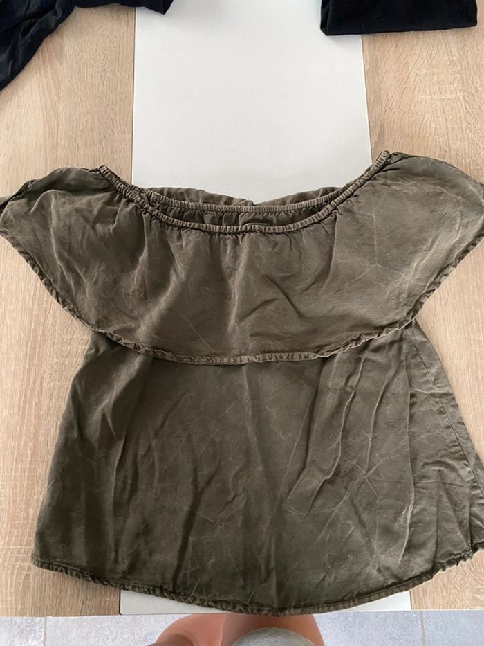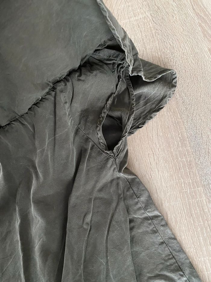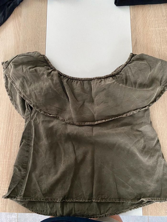Sous le volant il y a des vrais trous pour les manches ( voir photo ) Couleur kaki effet jean #Tshirtfemme8