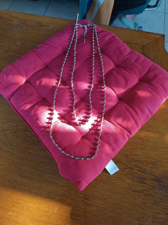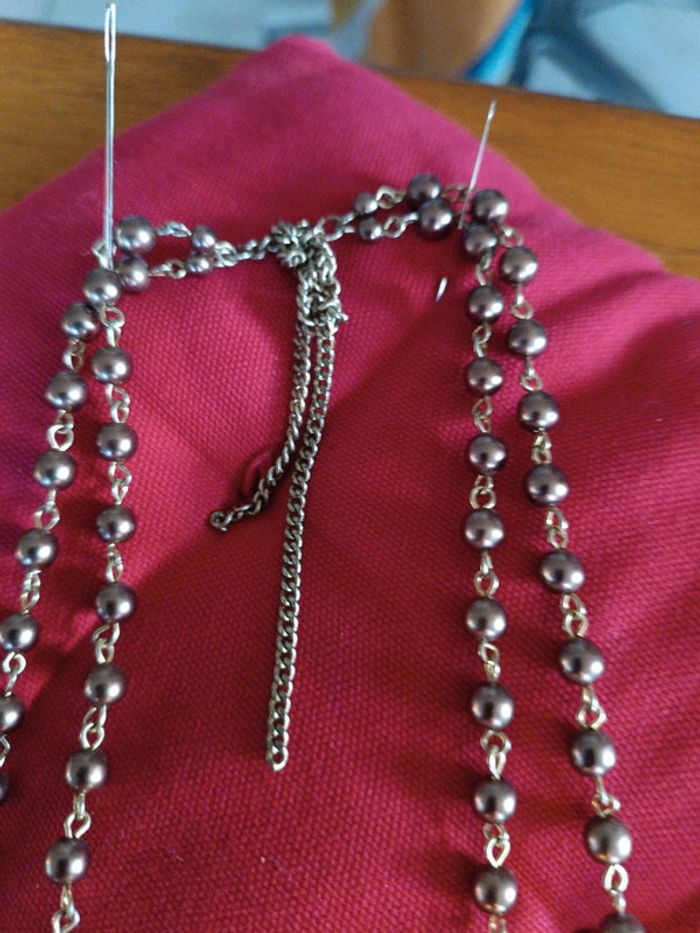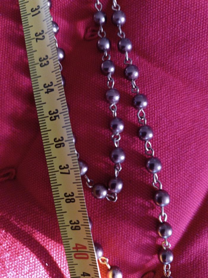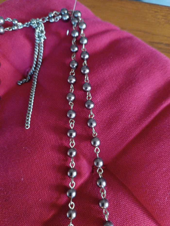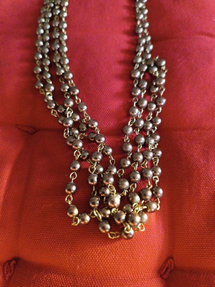 Sautoir perles marron/doré, intérieur 38 cm, extérieur 49 cm. Fermeture chaîne nouée. Mailles métal entre les perles. Se passe par la tête. TBE