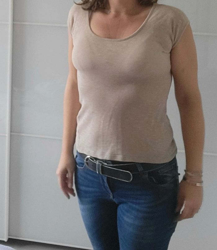 📌20% de remise dès 5 articles T-shirt uni beige ➡️Largeur à plat sous les bras 42 cm ⭐Excellent état ✈Envoi rapide des colis 💗 Abonnez vous à mon profil, nombreux articles ajoutés régulièrement ! #laetitresors_tshirt36 #laetitresors #tshirt #beige #cache #cache #uni #manche #courte