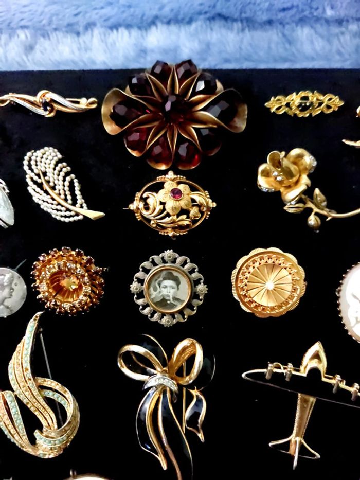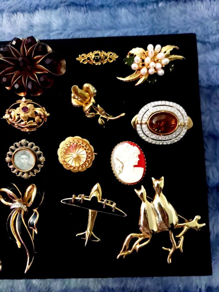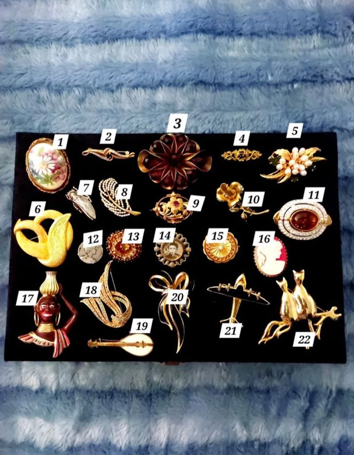 Possibilité d'acheter à l'unité ou en lot : 1 : broche porcelaine de Limoges, fêlée au milieu, bon état 25€ 2 : VENDUE 3 : broche vintage en provenance de Tchécoslovaquie perles en verre de bohème 150€ 4 : VENDUE 5 : Broche vintage en plaqué or avec perles de culture 45€ 6 : Broche Dolce vita signée 25€ 7 : broche cigale art nouveau 39€ 8 : broche vintage en perles blanches 25€ 9 : Broche Napoléon III avec rubis 150€ 10 : broche ancienne en plaqué or signée 45€ 11 : broche ambre vintage signée 55€ 12 : broche 1900 art nouveau signée 65€ 13 : broche art déco en cristal 35€ 14 : broche victorienne porte photo 45€ 15 : broche art deco en plaqué or avec poinçon 55€ 16 : Broche camée bicolore en résine 35€ 17 : Broche femme africaine vintage 35€ 18 : broche ancienne année 50, avec perles de turquoise 25€ 19 : broche mandoline vintage 25€ 20 : broche vintage signée D'orlan paris 45€ 21 : broche avion noir et doré 20€ 22 : broche couple de chat sur une branche 20€
