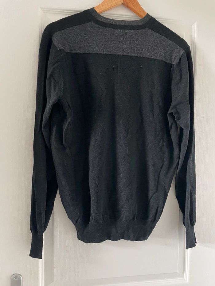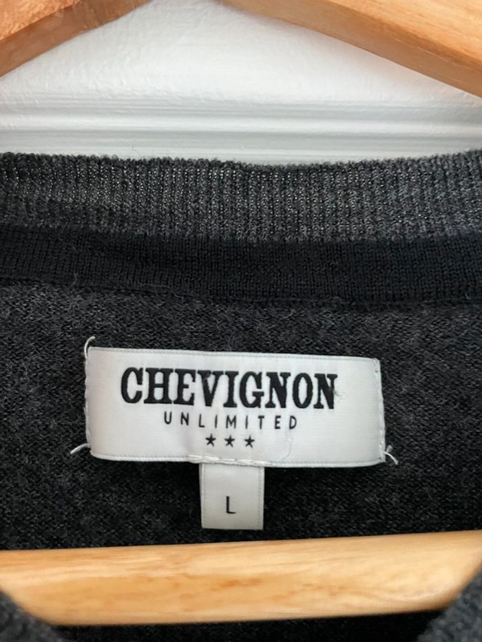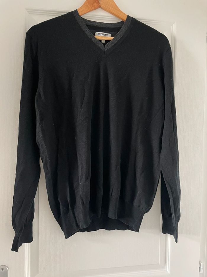 Pull à col V noir et gris, en très bon état. 100% en laine Taille : L Marque : Chevignon