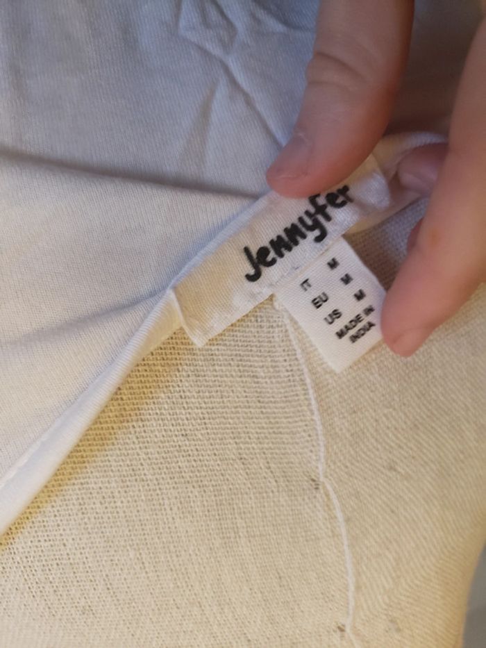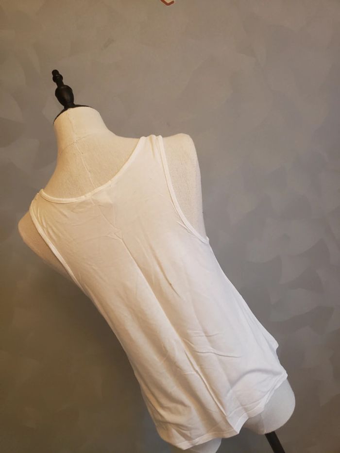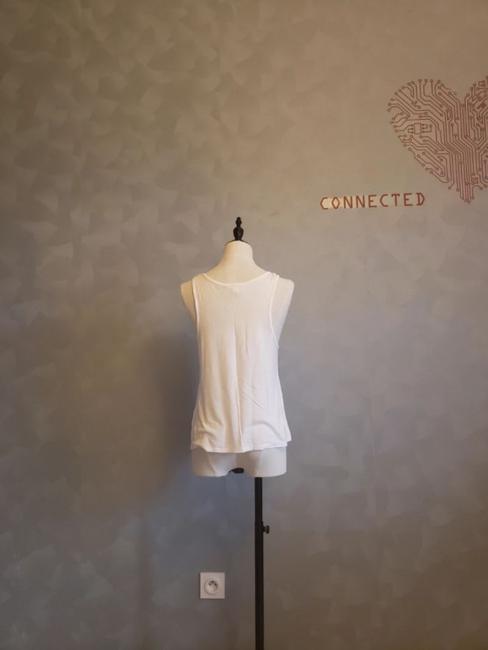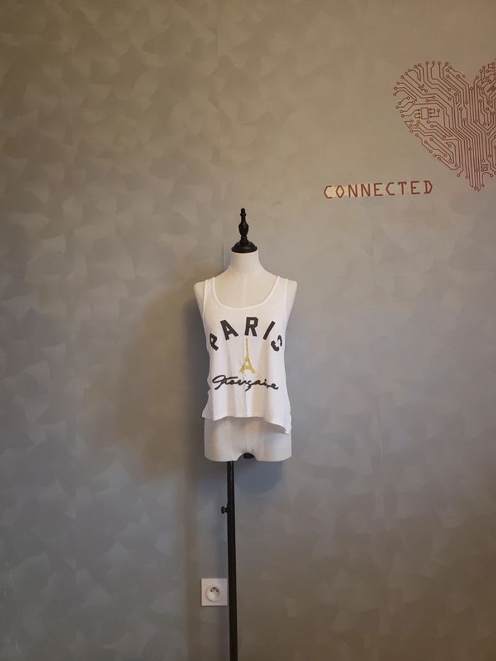 Débardeur 🎀 en parfait état Couleurs : blanc, noir et doré Motif : écriture + Tour Eiffel Décolleté (voir photo 2) Débardeur léger et transparent à la lumière (voir photo 5) Taille du mannequin : poitrine = 88cm, taille = 64cm, hanches = 83cm ⛔ Pas de photo porté ⛔ D'autres vêtements femme taille M : #clemencecavalierifemmeM