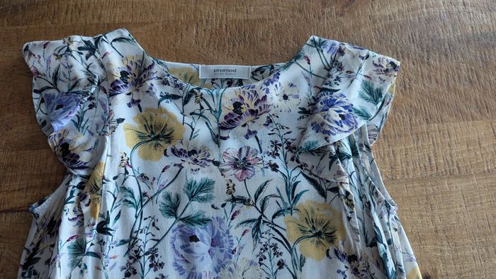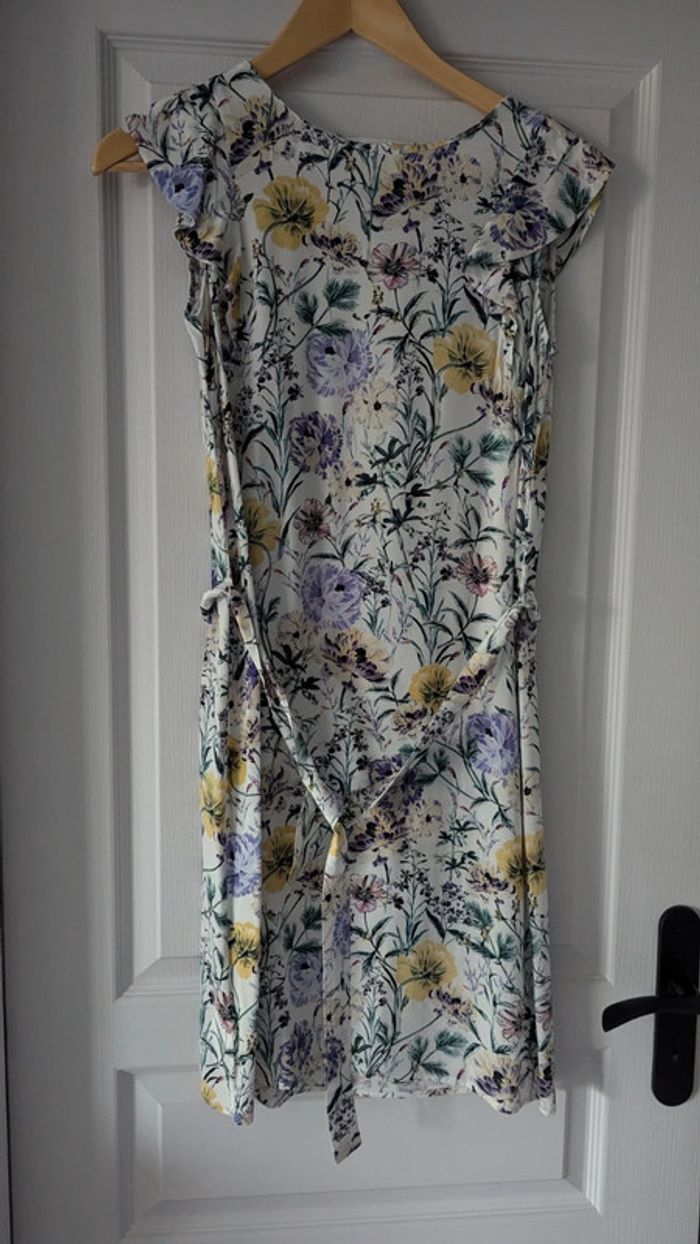 Robe à fleurs avec un lien à nouer à la taille (2 passants sur les côtés). Peu portée.
