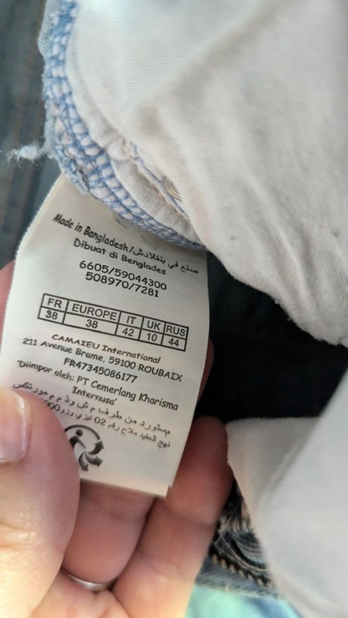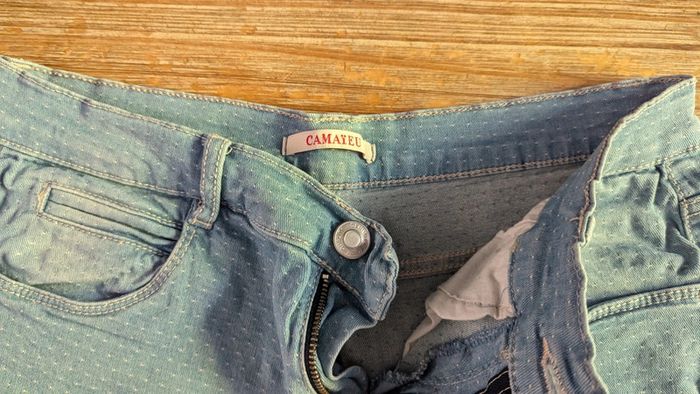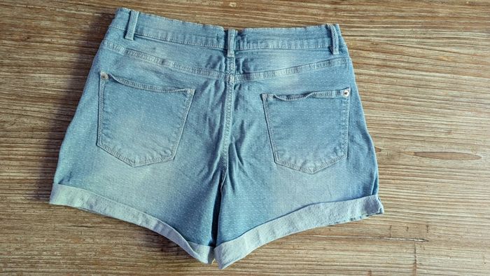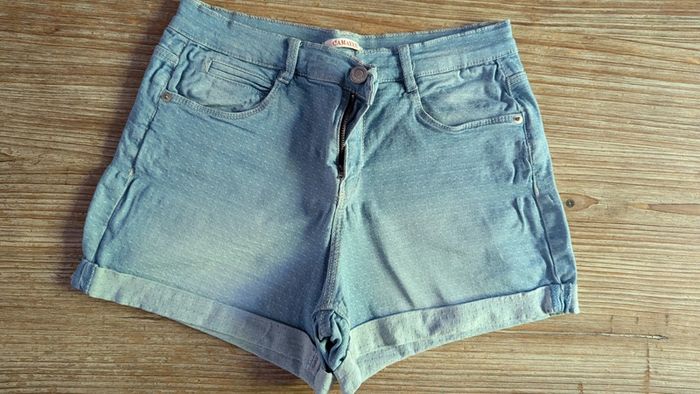 Short en jean clair avec dégradé de couleurs et petits points blancs.