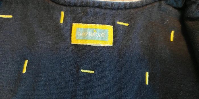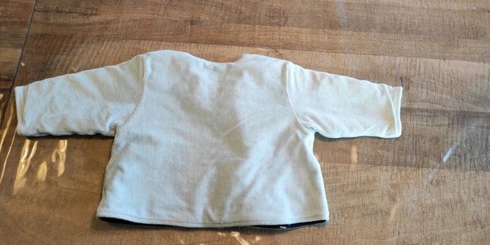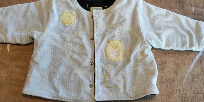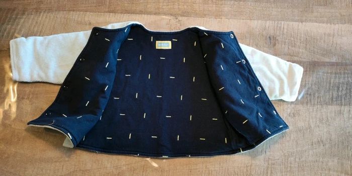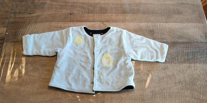 Veste chaude et molletonnée qui se ferme par boutons pressions devant. Idéal pour bébé entre 3 et 6 mois selon sa corpulence. Bleu ciel avec des dessins jaune clair. Très bon état.