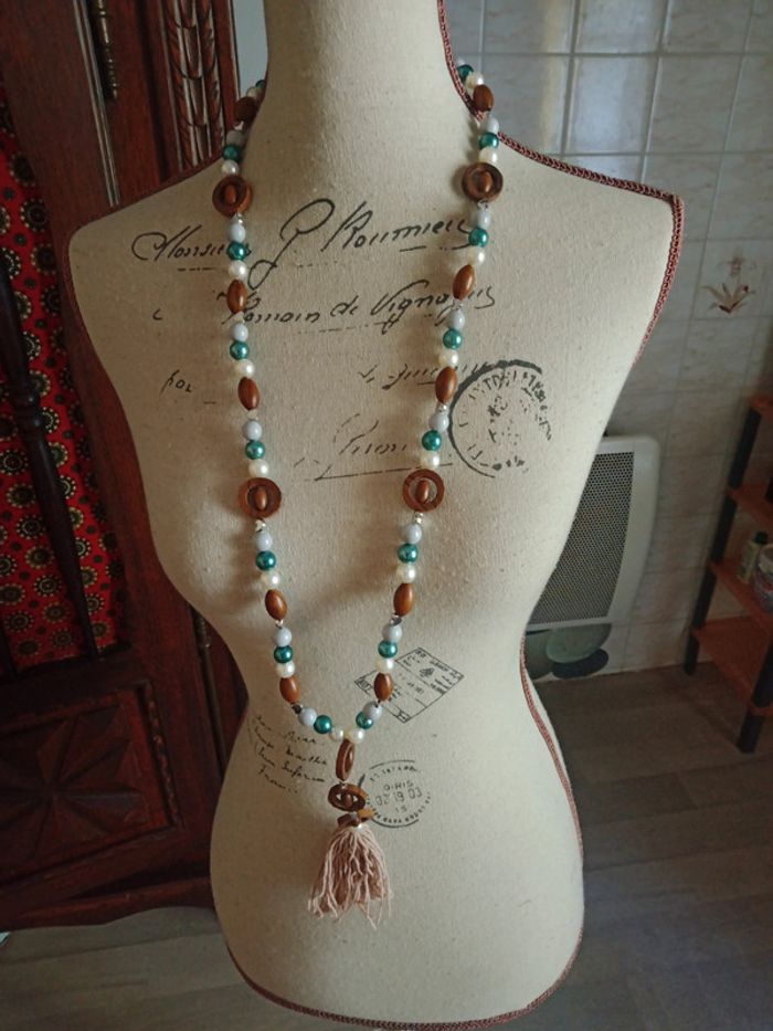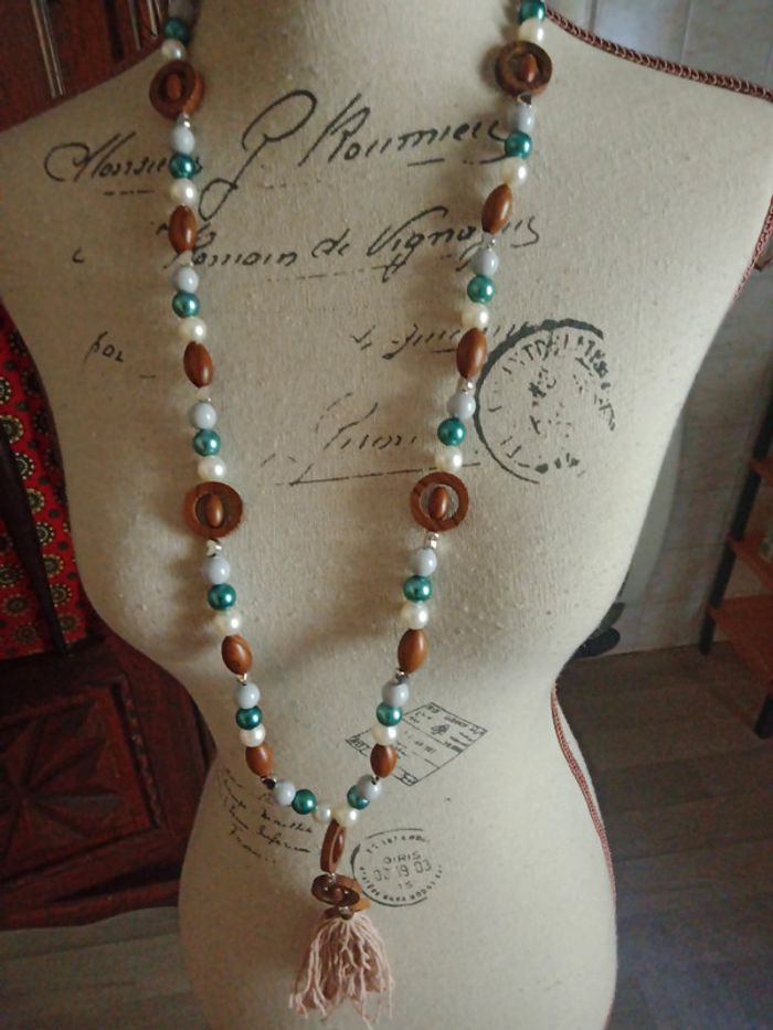 Collier fait main en perles bois et plastique avec pompon coton. Modèle unique inventé.