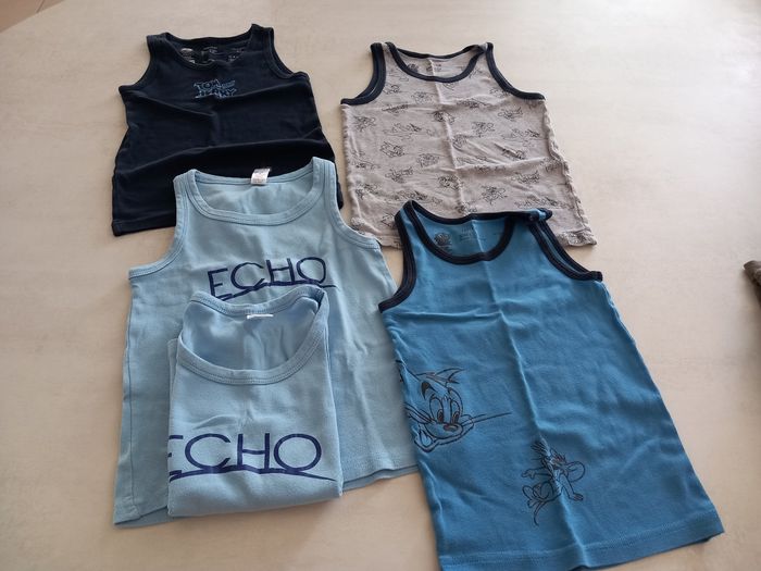 Lot vêtements garçon 6 ans 19 pièces en tout 5 débardeurs 5 t-shirts manches courtes ( il y a du 8 ans mais taille petit) 1 t-shirt manches longues 1 polaire (8 ans mais taille petit) 1 sweat 2 gilets 3 pantalons 1 pyjama