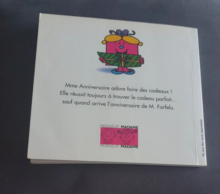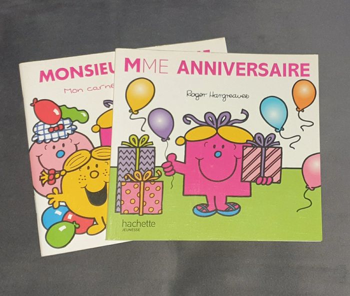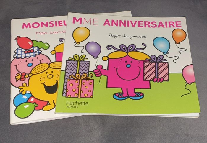 Lot Monsieur Madame spécial Anniversaire 🎁 🎈de chez Hachette jeunesse: - livre Mme Anniversaire - carnet d'anniversaire Monsieur Madame pour y noter tous les souvenirs de ce grand jour. En très bon état, inutilisés car eu en double exemplaire. Ils ont juste été feuilletés: aucune inscription dans le carnet. Faisaient parti d'1 coffret spécial anniversaire. Possibilité de vous envoyer la pochette cadeau, cependant celle-ci n'est plus en très bon état (voir les 2 dernières photos). Mes autres livres: #angy62340livres Maison non fumeur 🚭 et sans animaux 🐶🐱 Remise en main propre possible et envoi en Mondial relay ou chronopost de préférence. Composez vos lots et profitez de réductions: ✅ 2 articles -5% ✅ 3 articles -10% ✅ 5 articles et plus -20%
