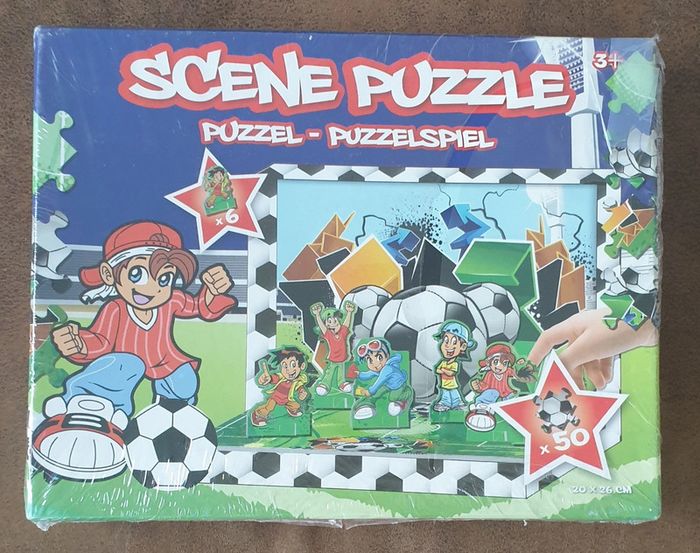 Puzzle sur le thème du football: une fois le puzzle assemblé, il s'agit d'une scène sur laquelle on peut jouer avec 6 personnages. Le puzzle est neuf et jamais ouvert: cependant l'emballage transparent est déchiré par endroit (voir photo). Mes autres jeux pour enfants: #angy62340jouetsetpeluches Maison non fumeur 🚭 et sans animaux 🐶🐱 Remise en main propre possible et envoi en Mondial relay et chronoshop de préférence. Composez vos lots et profitez de réductions: ✅ 2 articles -5% ✅ 3 articles -10% ✅ 5 articles et plus -20%