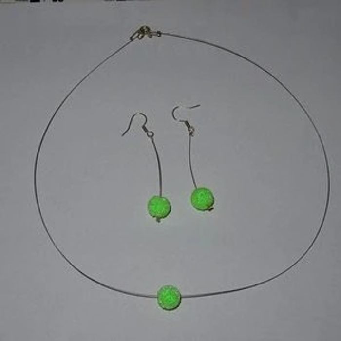 Parure collier et boucles d'oreilles avec perles givrées vert fluo : Parure composée : - d'un collier monté sur du fil dit câblé couleur argent et comportant une perle dite givrée (pas lisse), verte fluo. Tour de cou = 46.5 cm environ. - de boucles d'oreilles assorties : une perle dite givrée (pas lisse), verte fluo. Les boucles sont montées sur des attaches dites américaines pour oreilles percées couleur argent et mesurent environ 4.8 cm de long. Cette parure est légère et facile à assortir que ce soit avec vos tenues du quotidien comme celles plus habillées.