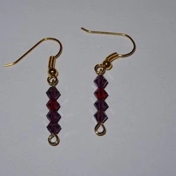 Boucles d'oreilles strass Swarovski violets et fuchsia : Boucles d'oreilles composées de strass toupies Swarovski : deux violets et une fuchsia. Elles sont montées sur des attaches dites américaines pour oreilles percées, couleur or, et mesurent 2.4 cm de long environ. Ces boucles d'oreilles sont légères et faciles à assortir que ce soit avec vos tenues du quotidien comme celles plus habillées.