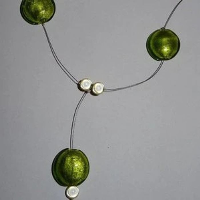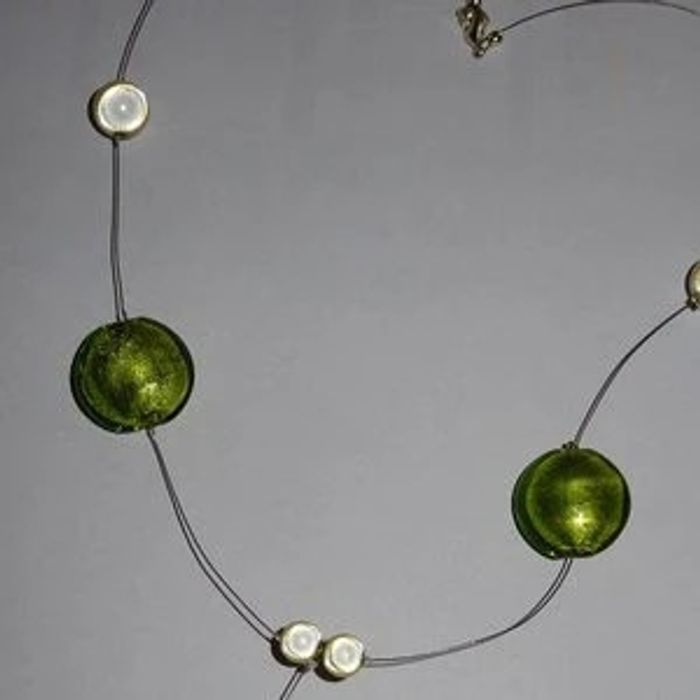 Collier avec perles de verre vertes et perles magiques beige : Collier monté sur du fil dit câblé couleur argent et comportant trois perles de verre rondes vertes et des perles dites magiques de couleur beige. Tour de cou = 54 cm environ. Ce collier est léger et facile à assortir que ce soit avec vos tenues du quotidien comme celles plus habillées.