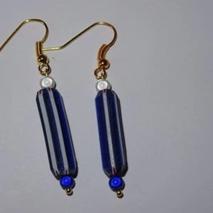 Boucles d'oreilles bleues et blanches : Boucles d'oreilles composées d'une perle allongée bleue rayée blanche et de deux petites perles dites magiques : une beige et une bleue. Elles sont montées sur des attaches dites américaines pour oreilles percées, couleur or et mesurent environ 3.5 cm de long. Ces boucles d'oreilles sont légères et faciles à assortir que ce soit avec vos tenues du quotidien comme celles plus habillées.