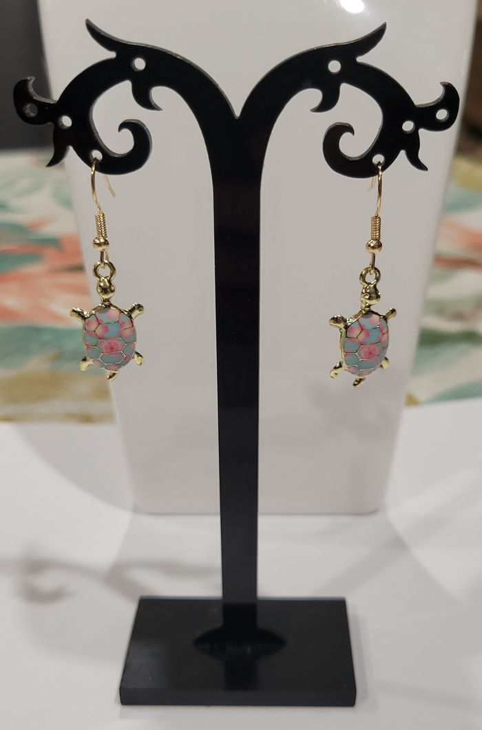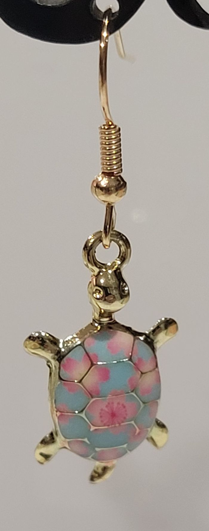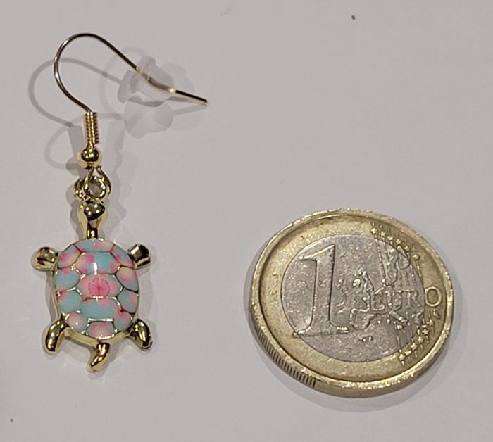 Boucles d'oreilles coloris doré motif tortue rose et bleu. Hauteur totale: 4,2 cms. N'hésitez pas à regarder mes autres ventes. Envoi rapide et soigné.